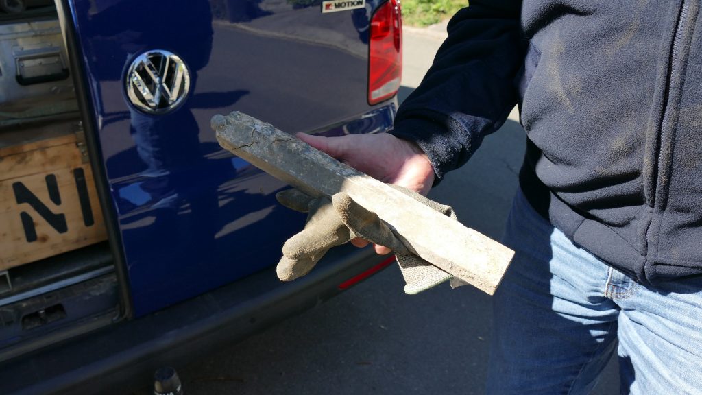 Der Kampfmittelbeseitigungsdienst des Regierungsbezirks Arnsberg erkundete die Räumlichkeiten und nahm den mutmaßlichen Fund genau in Augenschein. Dabei stellte sich rasch heraus, dass es sich nicht um eine noch zündfähige Weltkriegsbombe, sondern lediglich um Überreste einer britischen Stabbrandbombe* in Form eines sechskantigen Holzstabes handeln könnte.